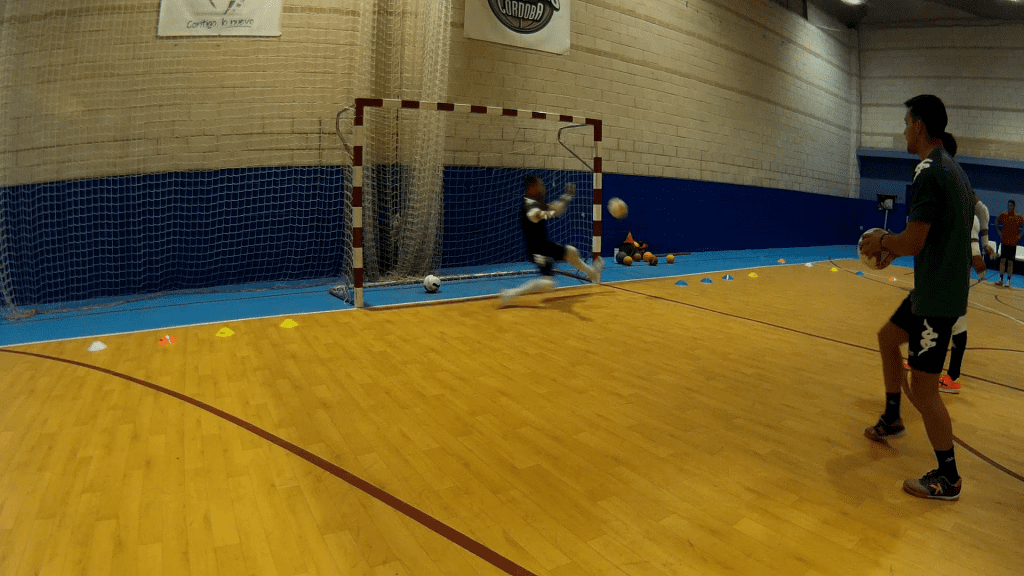- El portero devuelve pelota y realiza el gesto técnico hacia el cono del color que indicamos (si lo hay). Vamos cambiando conos tras cada serie, para que no los memoricen.